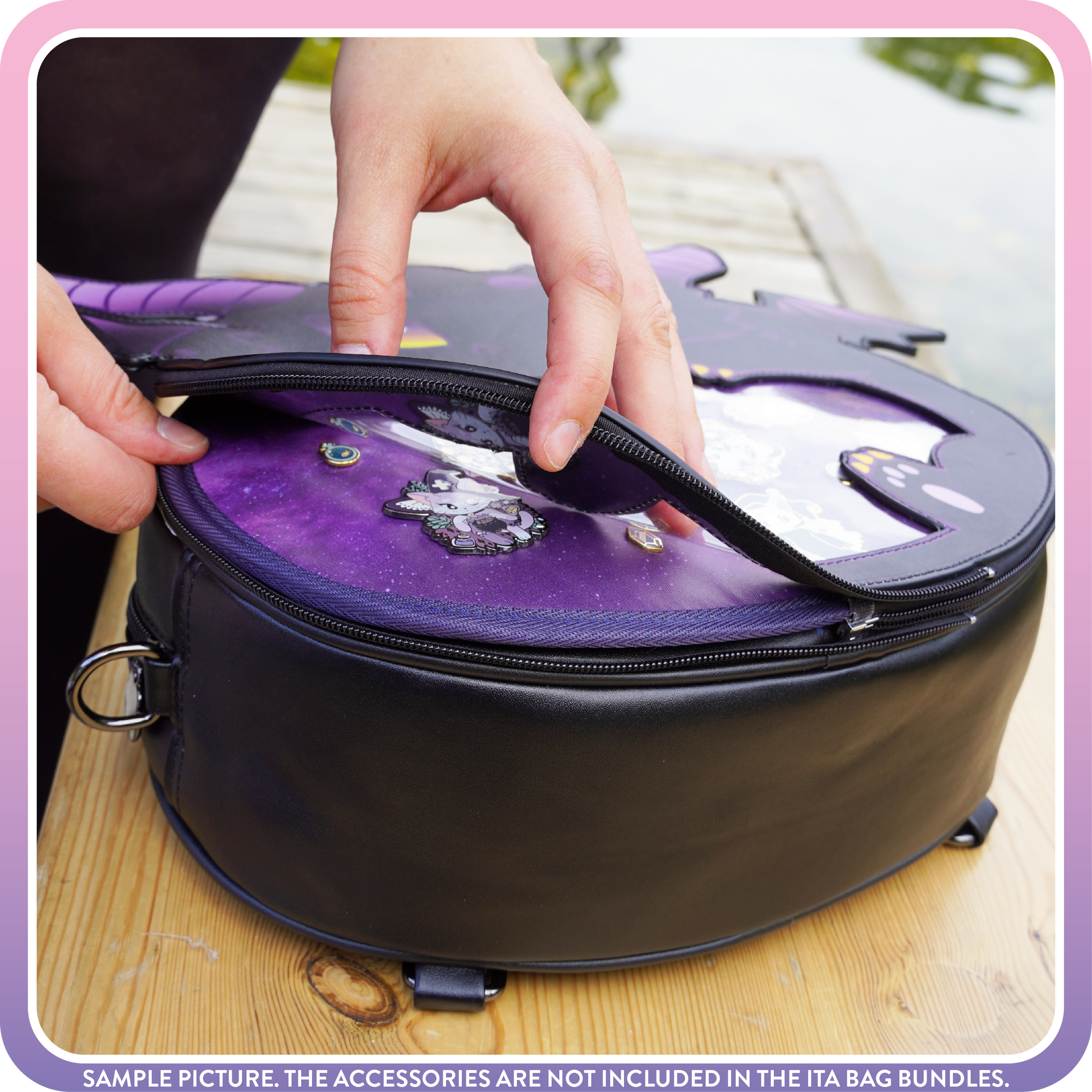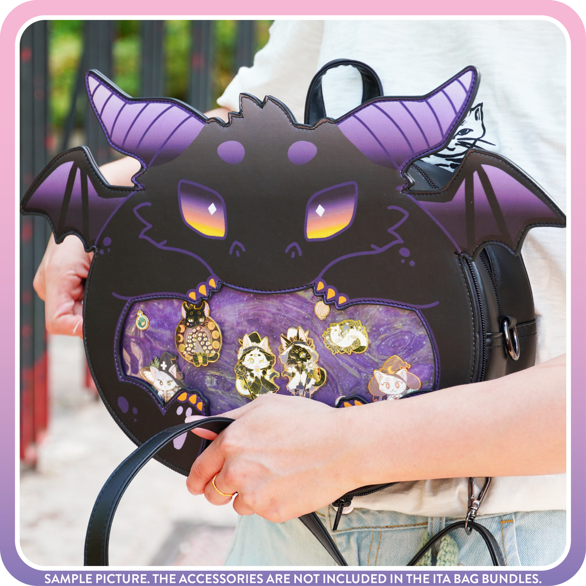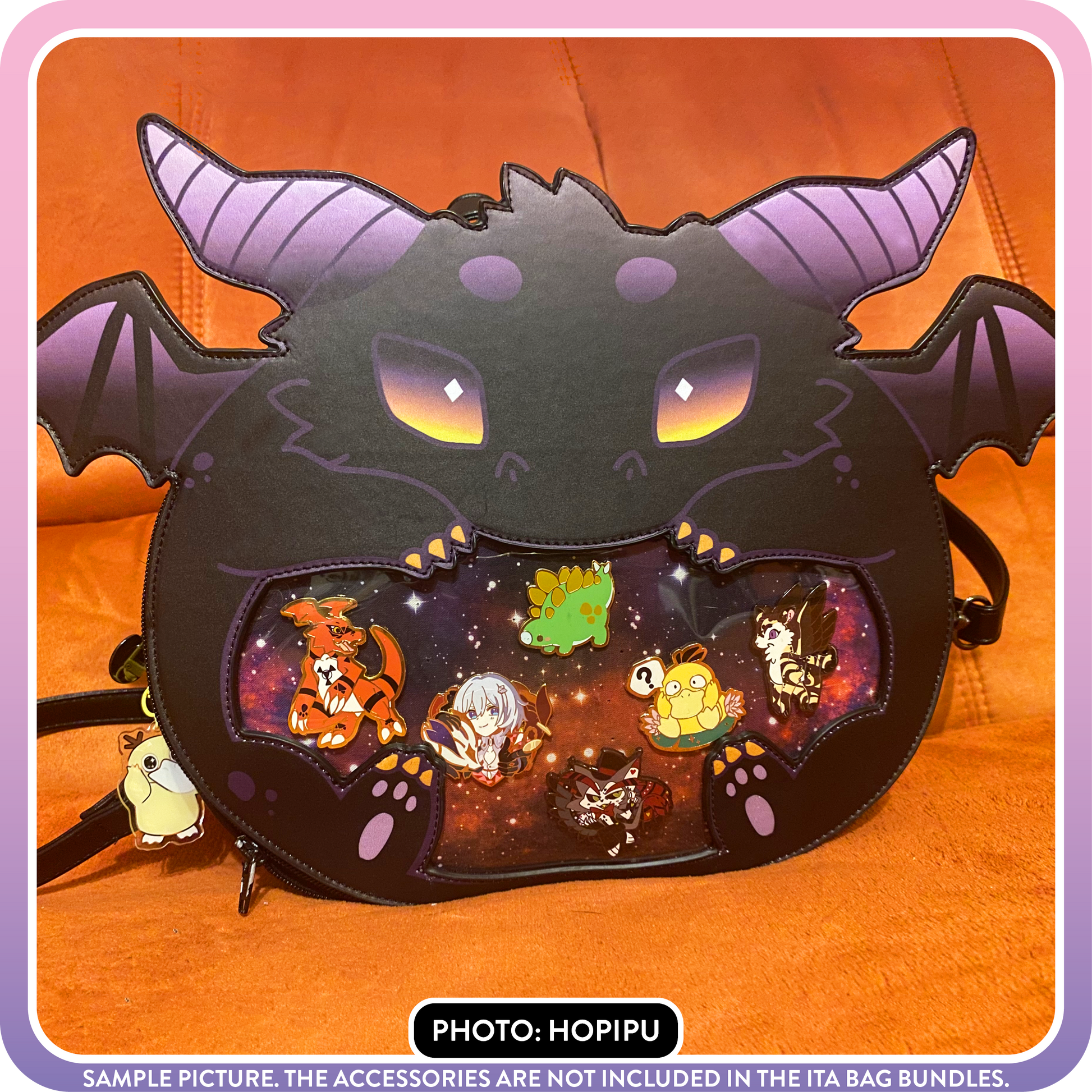 Cute Black Dragon Ita Bag with exchangable front design. Easily change the front designs by opening the zipper and attaching a different design. Each Ita Bag Bundle includes 1x Ita Bag Base, 1x matching front design, 1x matching insert, 1x matching tail, 2x backpack straps and 1x crossbody strap. Every ita bag comes with 1 random freebie B-grade pin <3 You'll also have the option to add additional front designs, pins, inserts, tails and so on - just check out this and the other Kawaii Kompanion listings <3