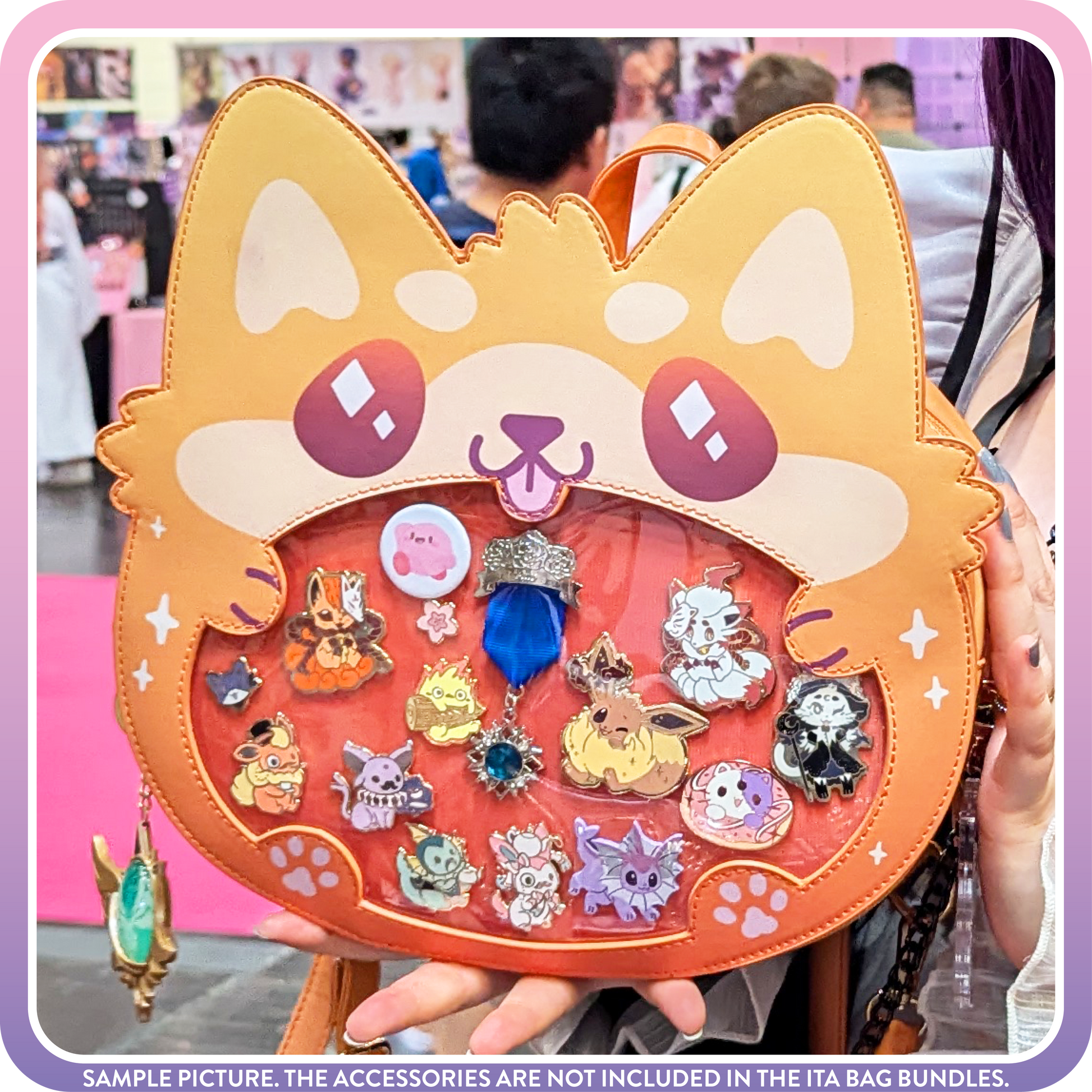 Cute Orange Shiba Ita Bag with exchangable front design. Easily change the front designs by opening the zipper and attaching a different design. Each Ita Bag Bundle includes 1x Ita Bag Base, 1x matching front design, 1x matching insert, 1x matching tail, 2x backpack straps and 1x crossbody strap. Every ita bag comes with 1 random freebie B-grade pin <3 You'll also have the option to add additional front designs, pins, inserts, tails and so on - just check out this and the other Kawaii Kompanion listings <3