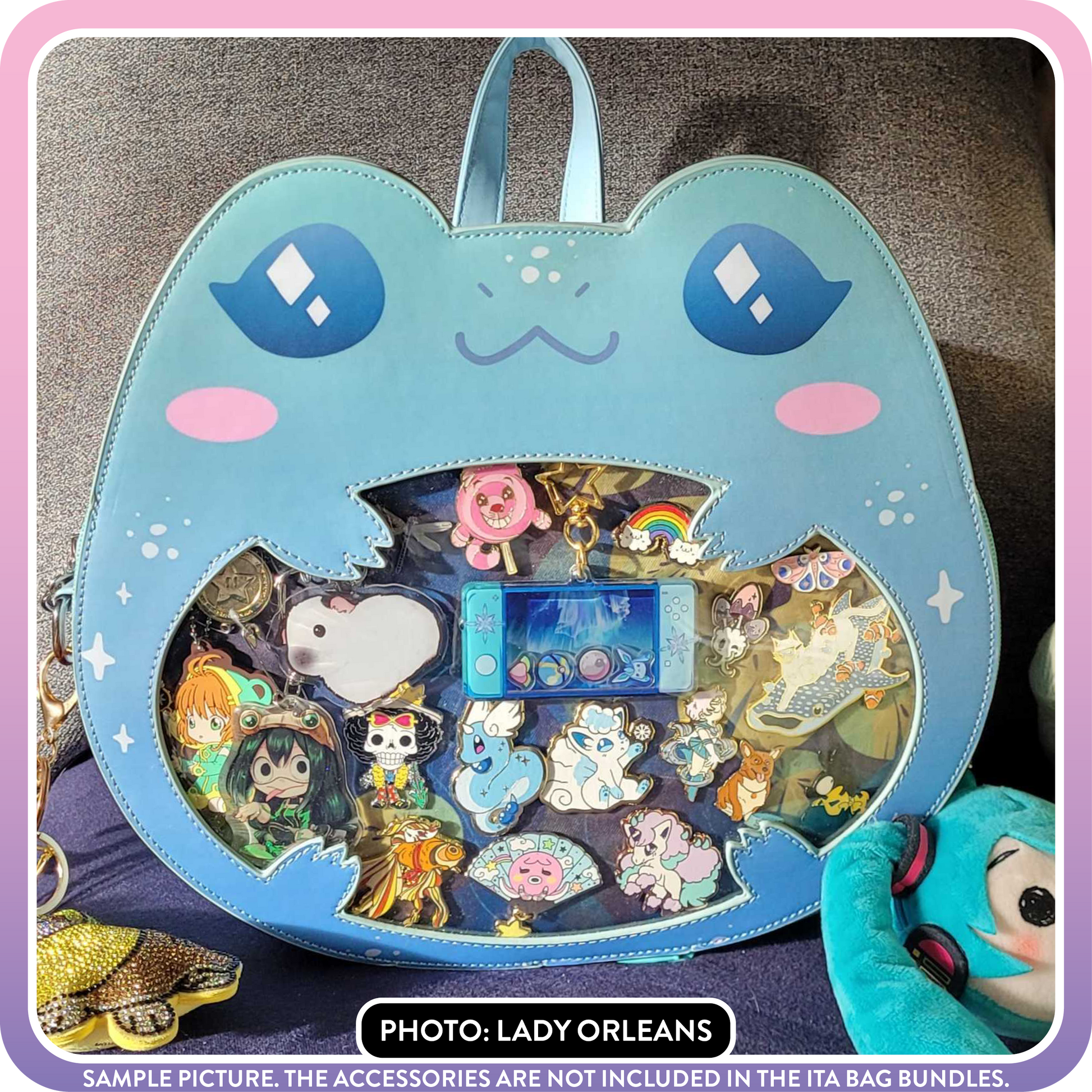 Cute Teal Frog Ita Bag with exchangable front design. Easily change the front designs by opening the zipper and attaching a different design. Each Ita Bag Bundle includes 1x Ita Bag Base, 1x matching front design, 1x matching insert, 1x matching tail, 2x backpack straps and 1x crossbody strap. Every ita bag comes with 1 random freebie B-grade pin <3 You'll also have the option to add additional front designs, pins, inserts, tails and so on - just check out this and the other Kawaii Kompanion listings <3